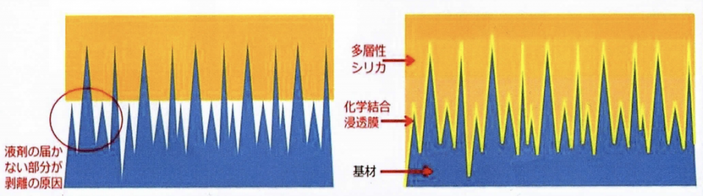 リキッド・バンパーは正真正銘ガラス被膜ができるガラスコーティングです。原材料にガラスコーティング剤国内特許取得の原料を使用しています。ケイ素系化合物が水(空気中の水分も含む)と化学反応を起こしてガラス被膜を形成します。溶剤はもちろん、水と反応してガラス被膜を作るという方法も特許です。