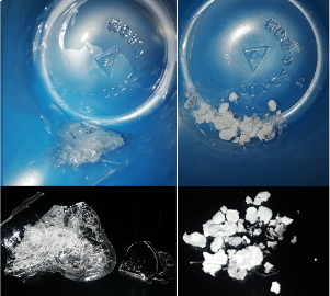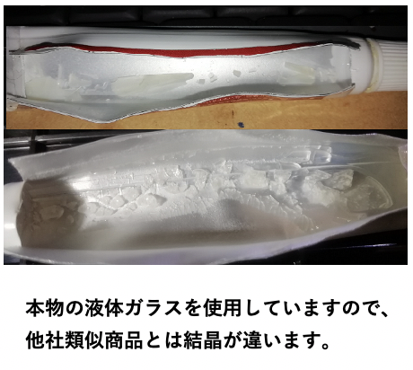 写真のように、溶剤を空気中に放置するとリキッド・バンパーは透明なガラス結晶ができます。他社製品の多くは透明な結晶ができず、触るとボロボロと崩れる白い粉の塊になります。